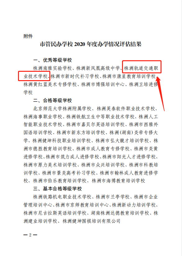 喜報!我校榮獲株洲市2020年年度辦學評估優秀學校 發布時間:2021-05-12 08:53:18 瀏覽量:4341 發布者:株洲軌道交通職業技術學校 喜 報 株洲軌道交通職業技術學校在2020年株洲市辦學情況評估中獲評 優 秀!2021我們將不忘初心,砥礪前行 株洲軌道交通職業技術學校全體教職員工將團結一心,奮勇拼搏,積極創造優良的辦學條件,提高辦學水平,突出辦學特色,專注城市軌道交通,鐵道運輸,幼兒保育、電子商務等專業特色,夯實現代職業教育辦學內涵,辦國家、社會、家長、學生、企業滿意的教育!歡迎2021級初中應屆畢業生報考株洲軌道交通職業技術學校招生代碼:3643000390
